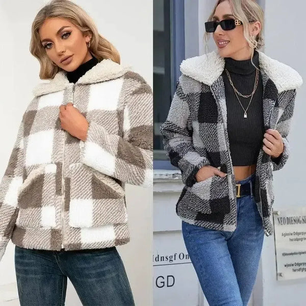 Casualowa pluszowa kurtka w kratę z kieszeniami z polaru jagnięcego