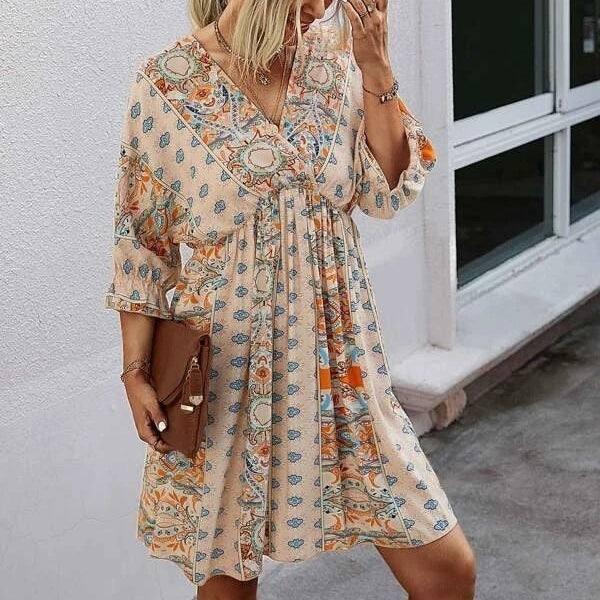 Sukienka z nadrukiem z poprzecznym dekoltem V i lamówką w talii