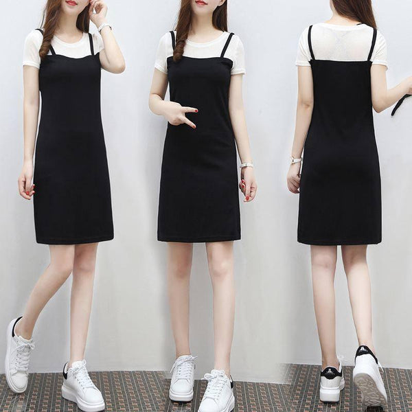 Dwuczęściowa letnia sukienka z krótkim rękawem i długimi szelkami