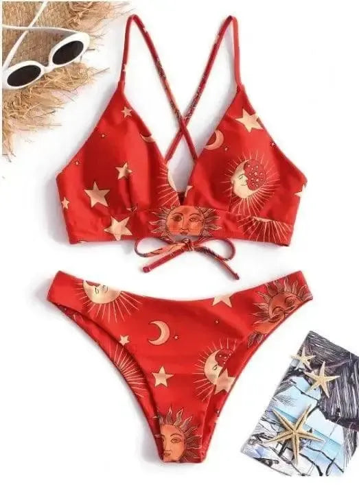 Bikini Sun Moon Star Print z wysokim stanem i rozcięciem w talii