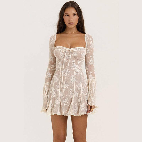 Koronkowa sukienka z kwadratowym kołnierzykiem z długim rękawem i wiązaniem w kształcie litery A Odzież Damska
