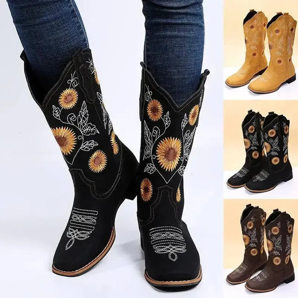 Botki kowbojki damskie z haftem słonecznika Buty na niskim obcasie