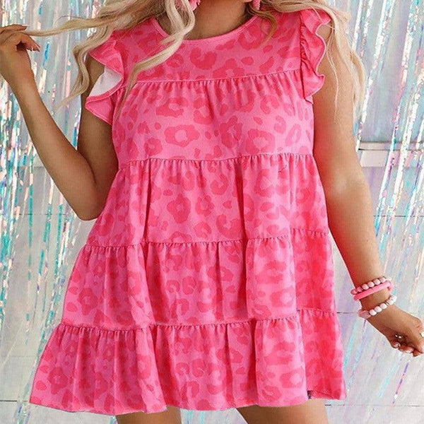 Letnia mini sukienka z falbankami na okrągłym dekolcie w panterkę