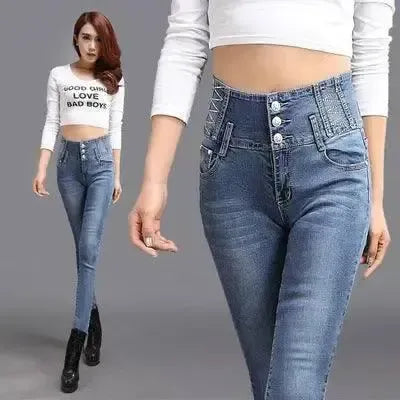 nowe damskie jeansy z wysokim stanem i zapięciem na klamrę, koreańskie