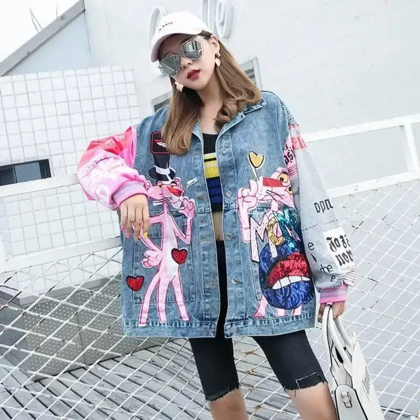Cartoon Leopard Sequin Print Stitching Denim o średniej długości
