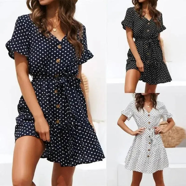 Casualowa szyfonowa sukienka damska w kropki z wysokim ramiączkiem i dekoltem w szpic