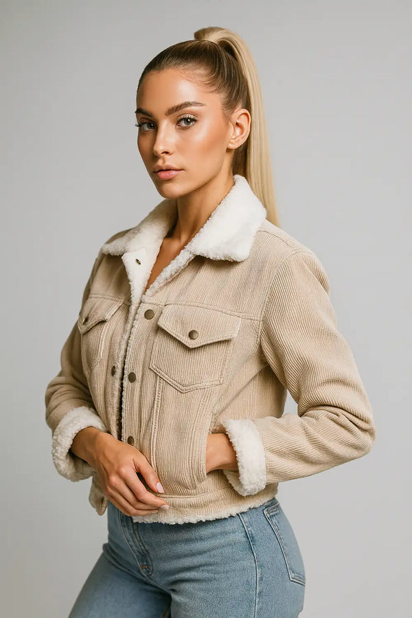Długa kurtka sztruksowa z podszewką ze skóry jagnięcej