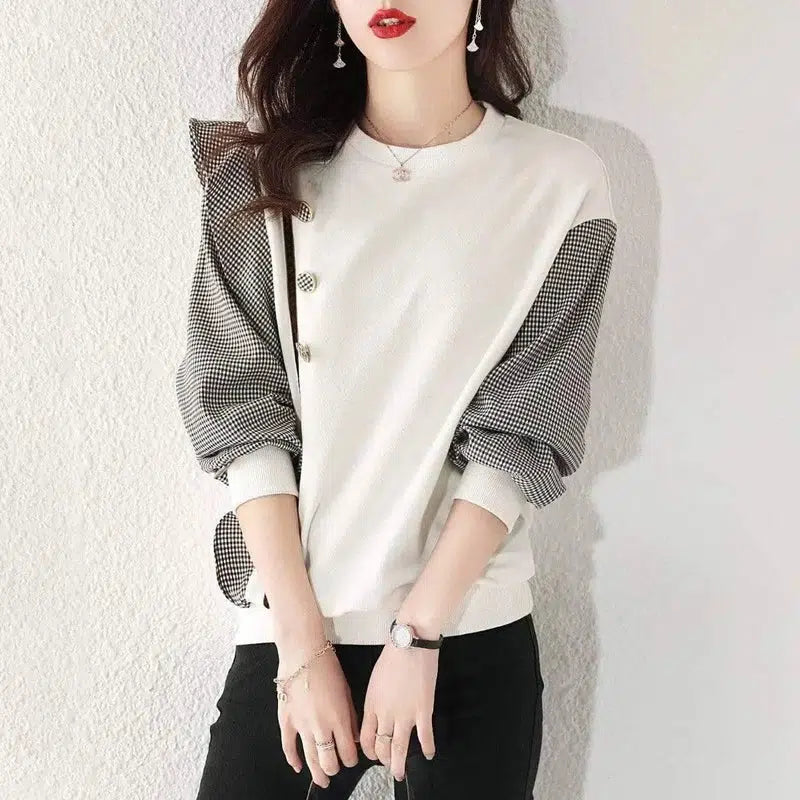 Design Sense Lantern Sleeve Stitching Koreańska bluza z kapturem w kratę