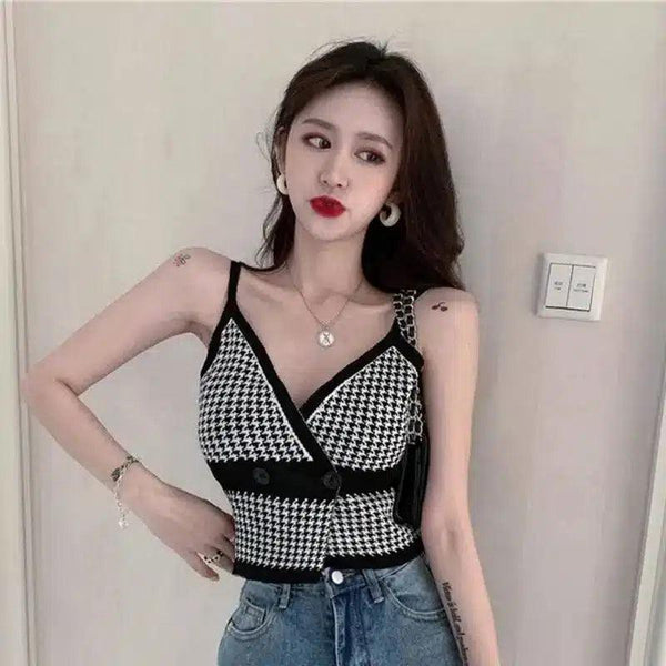 Damski top bez rękawów w pepitkę z dekoltem w szpic