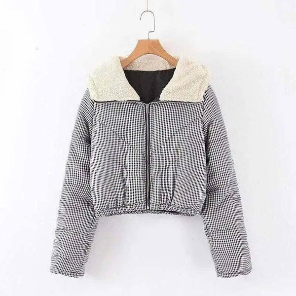 Krótka kurtka z dużymi klapami w kratę, bawełniany płaszcz z kapturem