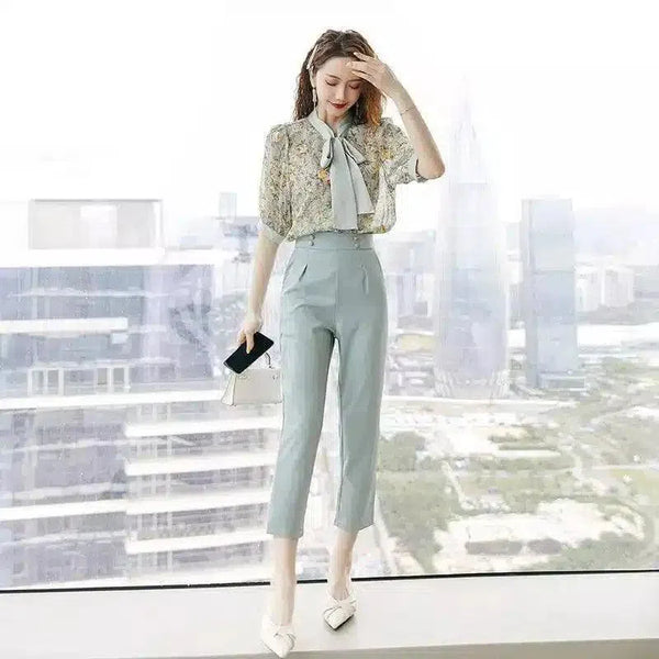 Elegancka damska bluzka z wiązanym dekoltem i przycięte spodnie