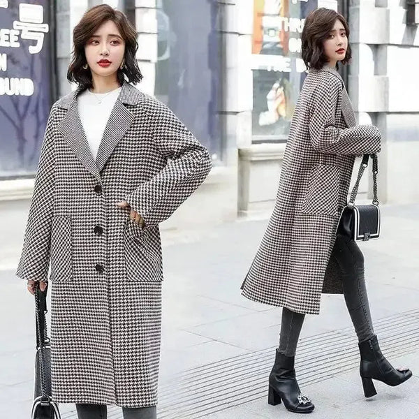 Damski płaszcz zimowy w pepitkę z kieszeniami