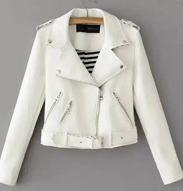 Włącz tę białą kurtkę moto ze sztucznej skóry do swojej garderoby, aby dodać odrobinę elegancji i