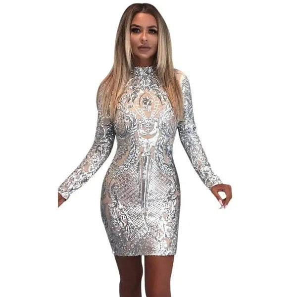 Elegancka sukienka na imprezę z wysokim dekoltem i długim rękawem z cekinami