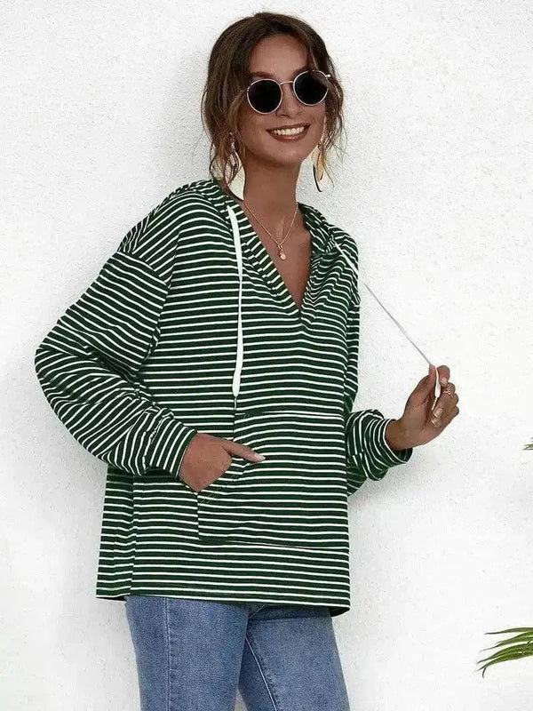 - Dekolt: V-neck z kapturem ściąganym sznurkiem