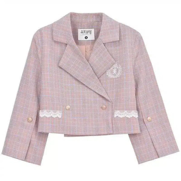 - Szczegóły projektu: Dwurzędowe zapięcie, koronkowe wykończenia na kieszeniach, wzór w kratkę