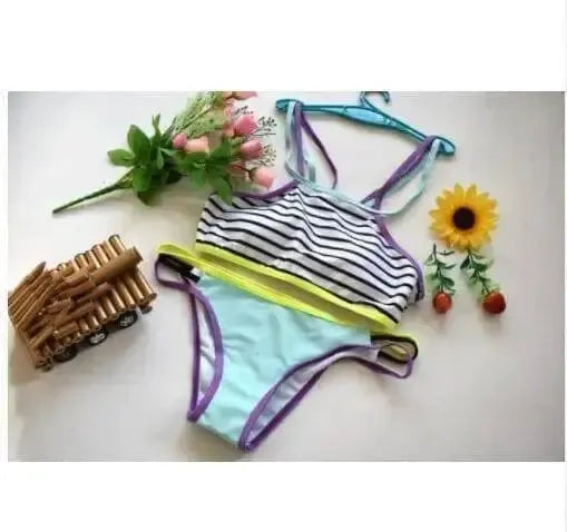 Patchworkowy kostium kąpielowy z wysokim dekoltem w paski