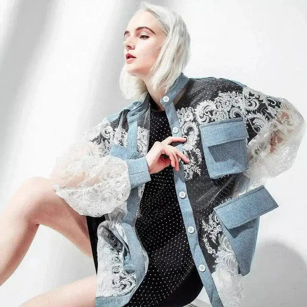 Damska kurtka dżinsowa z koronkowymi rękawami