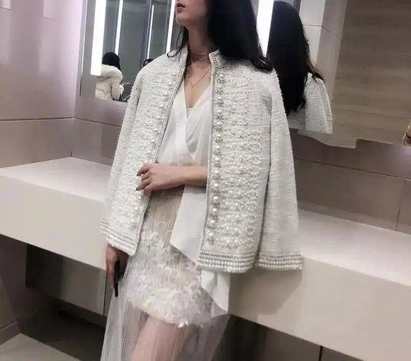Damska tweedowa kurtka z perłowymi zdobieniami