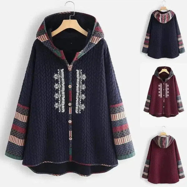 - Styl dekoltu lub ramion: Kaptur z wzorzystą podszewką