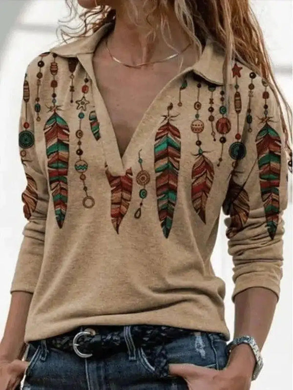 Sweter koszulowy z długim rękawem i nadrukiem V-neck w stylu retro