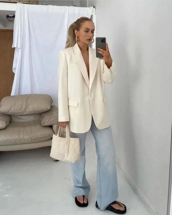 Damska dopasowana marynarka i dżinsy z szerokimi nogawkami