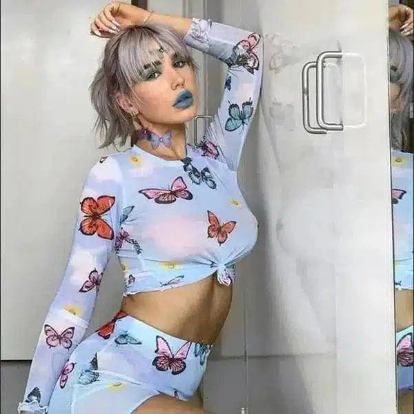 - Design: Żywy nadruk w motyle na jasnoniebieskim tle