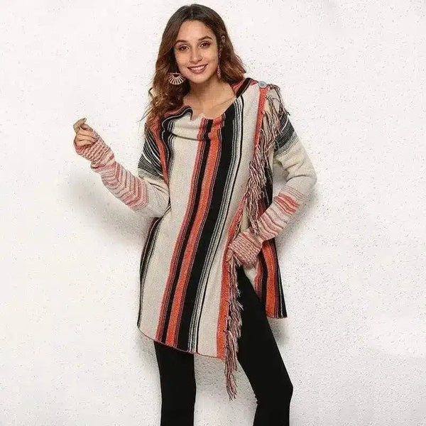 - Dodatkowe szczegóły: Asymetryczny dół z frędzlami; odważny wzór w paski w neutralnych i ciepłych odcieniach