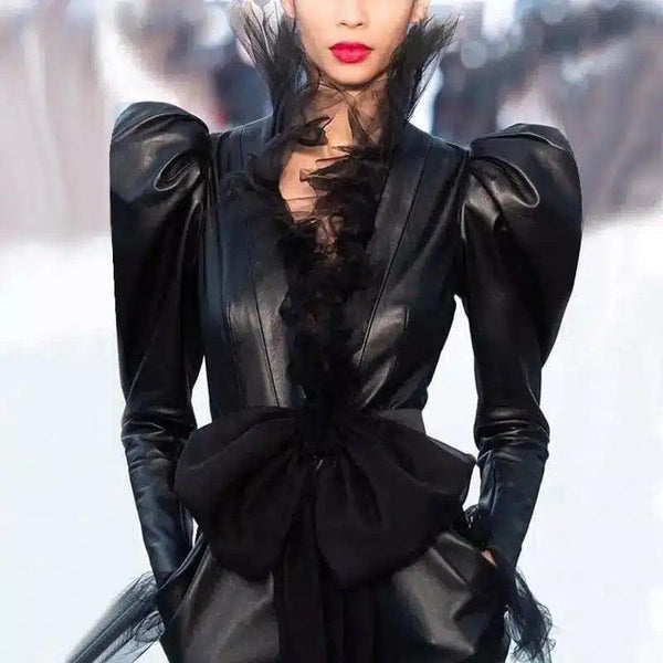 - Dodatkowe detale: Dmuchane ramiona, duża kokarda w talii, przezroczyste elementy przy dekolcie i mankietach