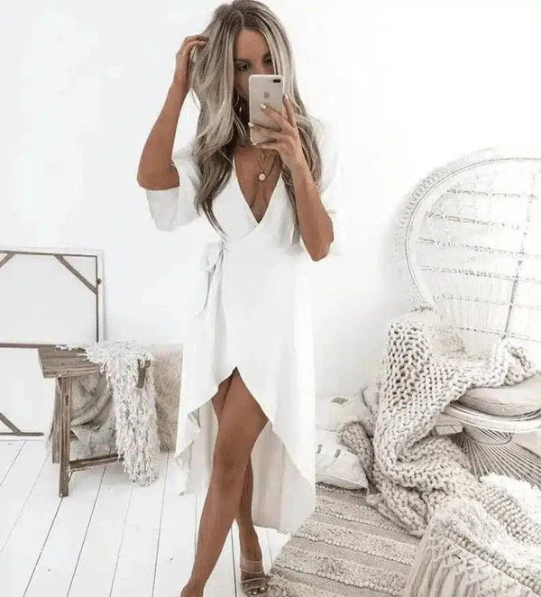 Elegancka sukienka z asymetrycznym dołem i dekoltem w serek