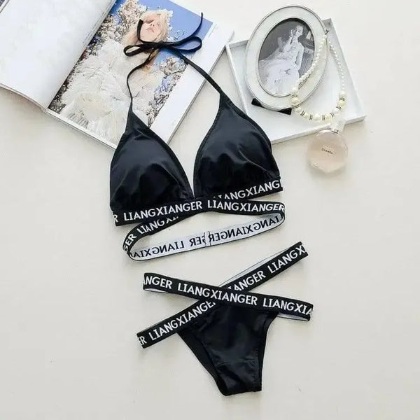 Strój kąpielowy damski czarny, dzielony, z zebraną klatką piersiową