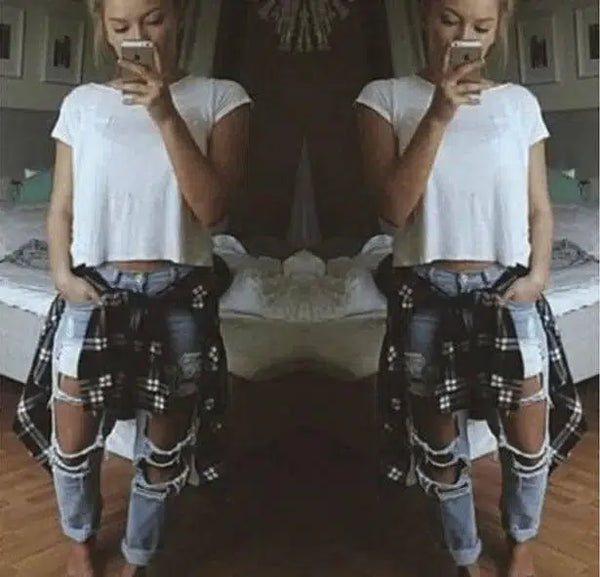 - Styl: Modne proste jeansy z nowoczesnym wzorem z dziurami
