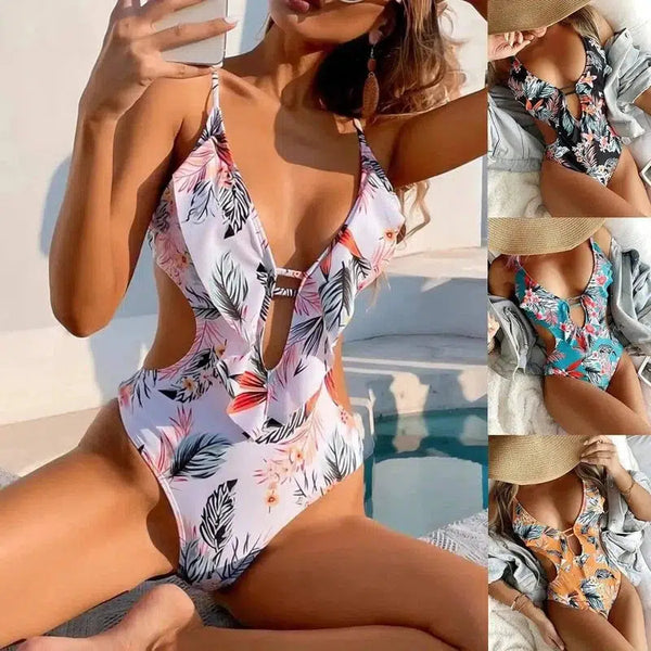Trójkątny jednoczęściowy kostium kąpielowy z falbanką z nadrukiem liści