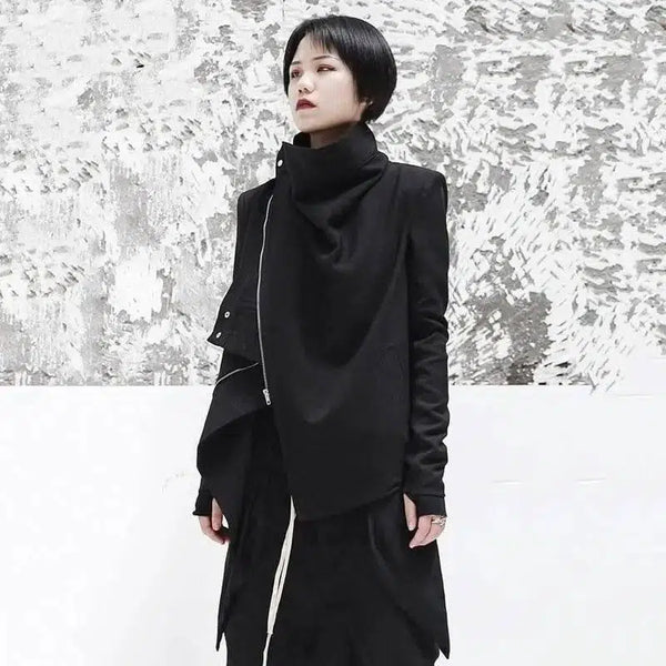 Czarny nieregularny płaszcz z długim rękawem i zamkiem błyskawicznym