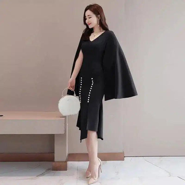 Elegancka damska sukienka z pelerynką i perłowymi akcentami