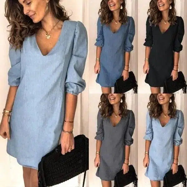 Casualowa luźna bawełniano-lniana sukienka z krótkim rękawem i dekoltem w serek