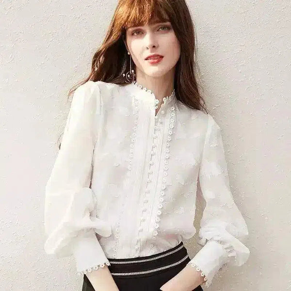 - Delikatne zapiekanki - Rękawy i kołnierzyk są wykończone zapiekanymi krawędziami, przyczyniając się do misternego i dopracowanego wyglądu bluzki.