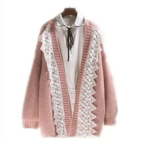 Kardigan z koronkowym wykończeniem i bluzka z wiązaniem na szyi