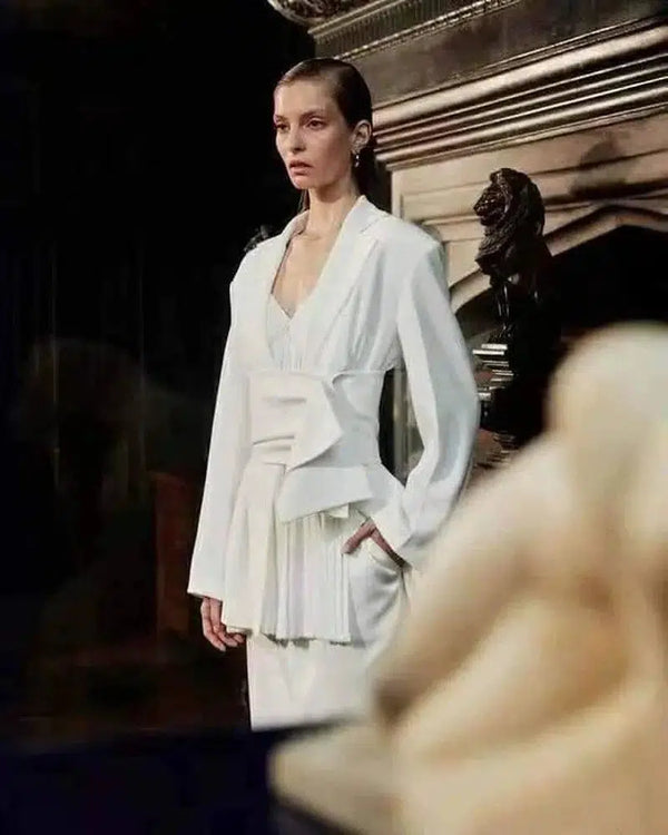 - Dekolt: Dekolt w kształcie litery V ze strukturalnym kołnierzem