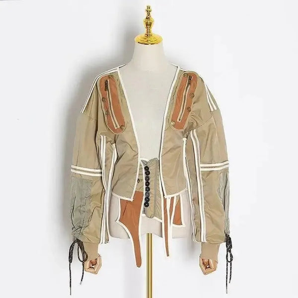- Dekolt: Otwarty przód ze strukturalnymi detalami na ramionach
