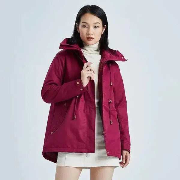 - Styl dekoltu lub ramion: Wysoki dekolt z odpinanym kapturem