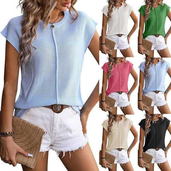 Nowy dzianinowy top z krótkim rękawem i okrągłym dekoltem na lato, luźny i swobodny