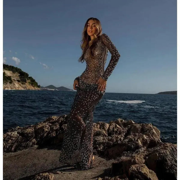 Opis produktu: Błyszcząca sukienka maxi z długim rękawem
