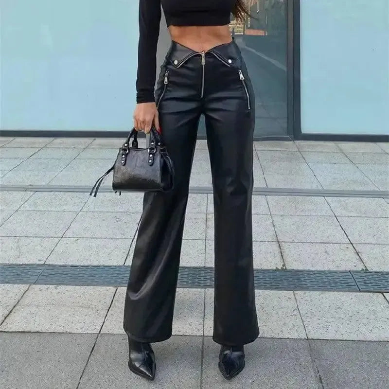 Luźne spodnie z szeroką nogawką i wysokim stanem, skórzane