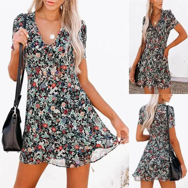 Damska sukienka w kwiaty z krótkim rękawem i dekoltem w serek