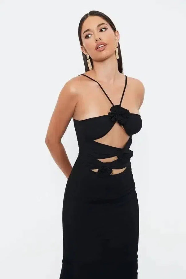 Sukienka z kwiatowym wycięciem na szyi i szelkami średniej długości